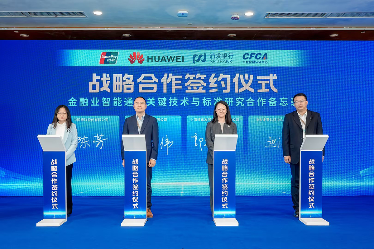 作为本次大会的核心环节之一,中国银联股份有限公司、华为技术有限公司、上海浦东发展银行股份有限公司与中金金融认证中心有限公司(CFCA)共同签署了《金融业智能通信关键技术与标准研究合作备忘录》,标志着四方在数字金融安全领域的战略合作正式启动。