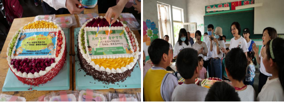 捐赠仪式的最后,山东分公司员工和学生们共同分享了饱含祝福的蛋糕,大家插上蜡烛许下心愿,一同在教室里唱起中国少年先锋队队歌:“我们是共产主义接班人,继承革命先辈的光荣传统,爱祖国爱人民,鲜艳的红领巾飘扬在前胸...”。